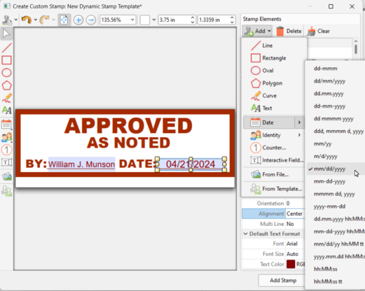 7. Select the Stamp Elements icon and choose Date > dd/mm/yyyy to place the field into the stamp. Format the field properties as needed.