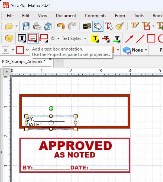 5. Select the Rectangle tool and draw the stamp rectangle. Sometimes, it is easier to create a new stamp by adding one from the preinstalled stamps library included with AcroPlot Matrix as a reference for size, linewidth(s), text styles, etc.